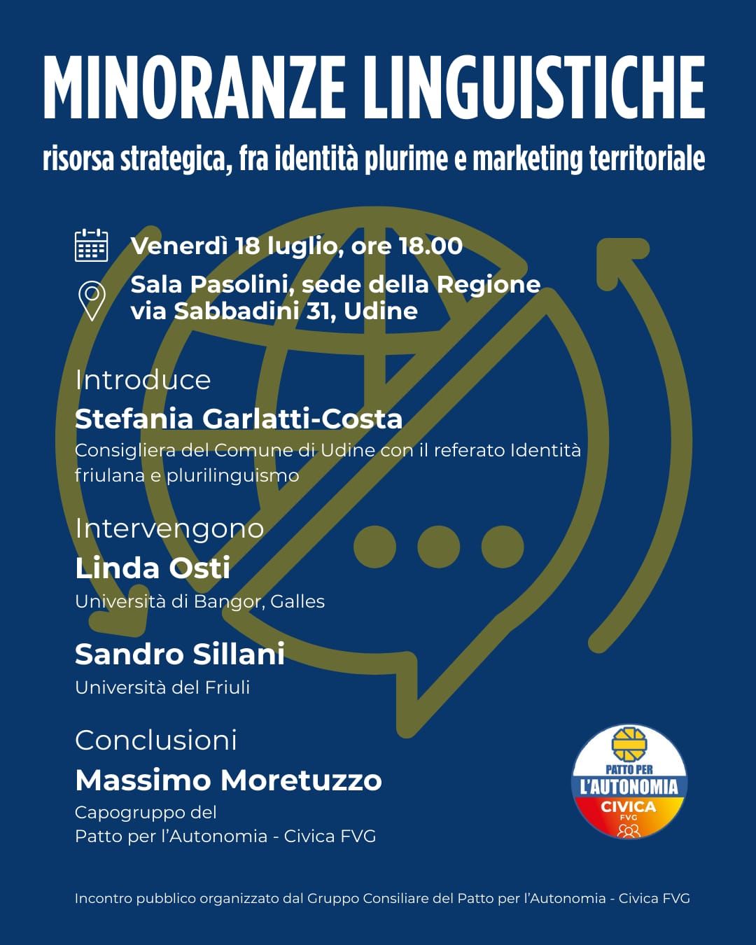 «Parleremo anche dell’interesse crescente delle multinazionali per i mercati e le lingue minori, e del sale Halen môr, che ci insegna che una salina atlantica può collocarsi come top di gamma grazie a una comunicazione che fa leva sulla narrazione di naturalità veicolata attraverso la lingua gallese», anticipa Stefania Garlatti-Costa, consigliera del Comune di Udine con il referato a Identità friulana e plurilinguismo, componente del direttivo del Patto per l’Autonomia, che introdurrà l’incontro. Le conclusioni saranno affidate a Massimo Moretuzzo, capogruppo del Patto per l’Autonomia – Civica FVG.