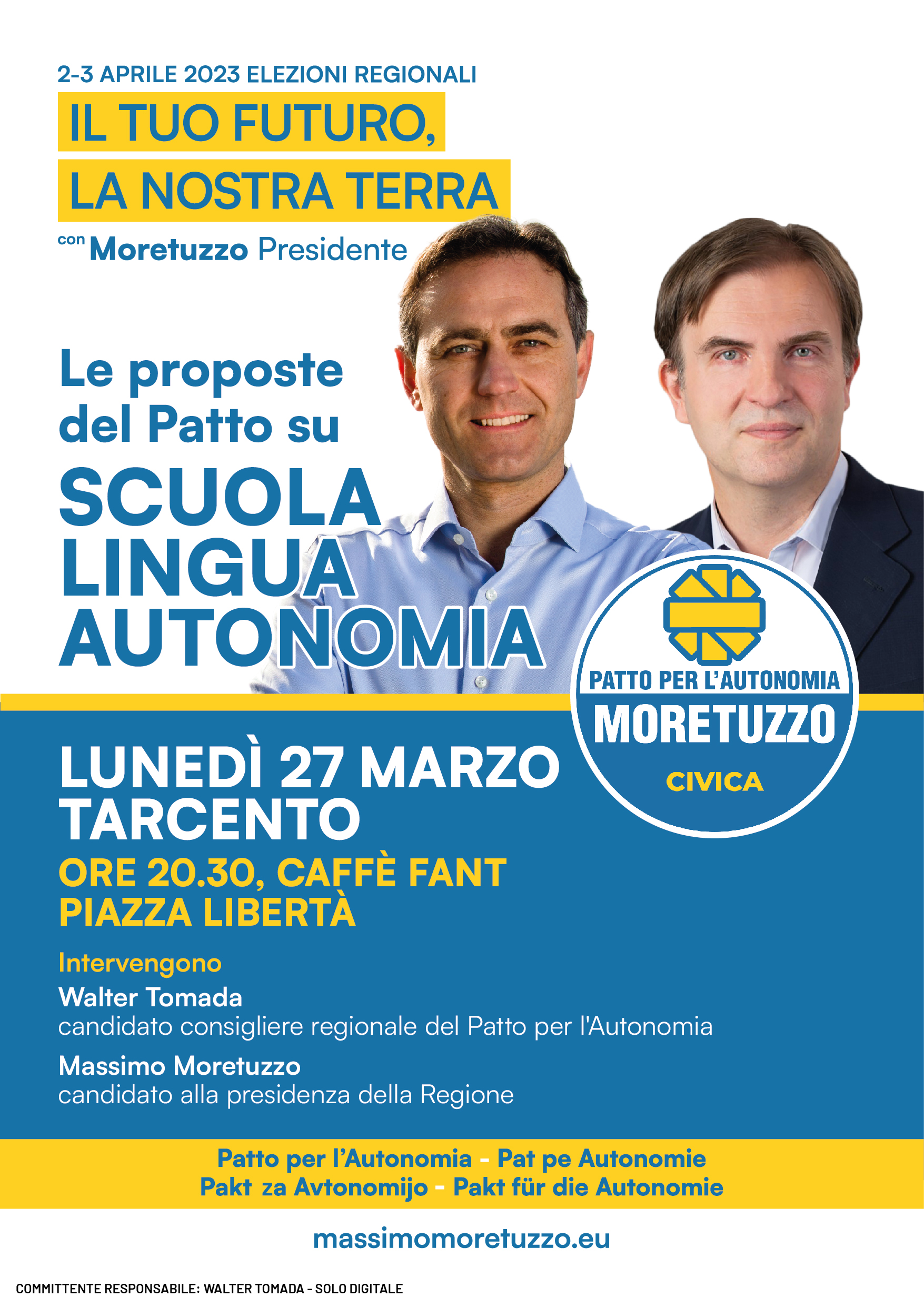 Lunedì 27 marzo a Tarcento, alle ore 20.30, al caffè Fant, in Piazza Libertà in via Spilimbergo, Massimo Moretuzzo e il candidato al Consiglio regionale per il Patto dell’Autonomia nella circoscrizione di Udine, Walter Tomada, incontrano le cittadini e i cittadini per un ascolto e un confronto su scuola, lingua e autonomia.