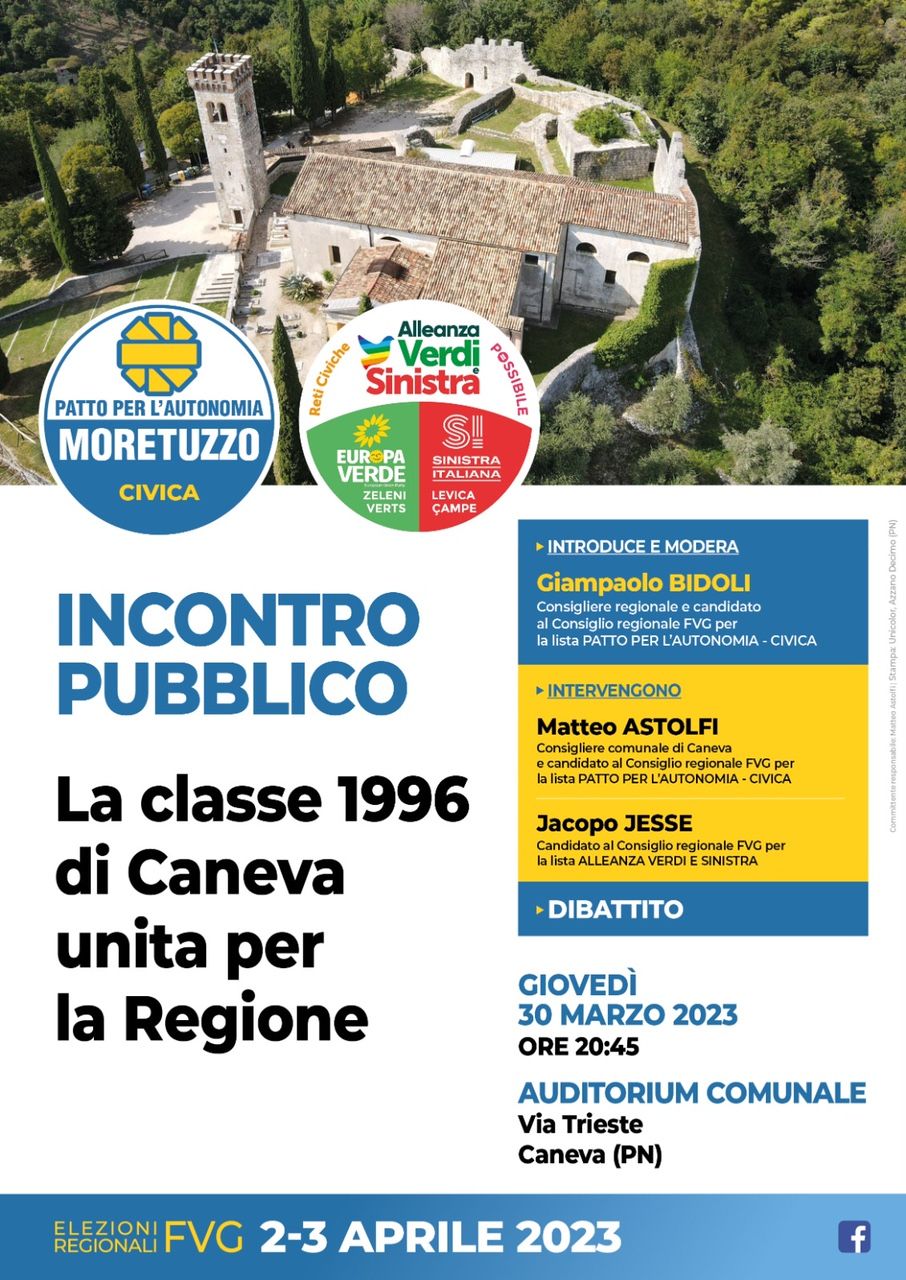 “La classe del 1996 di Caneva unita per la regione”. E’ questo il titolo dell’incontro in programma giovedì 30 marzo a Caneva, alle ore 20.45, nell’Auditorium comunale, in via Trieste.