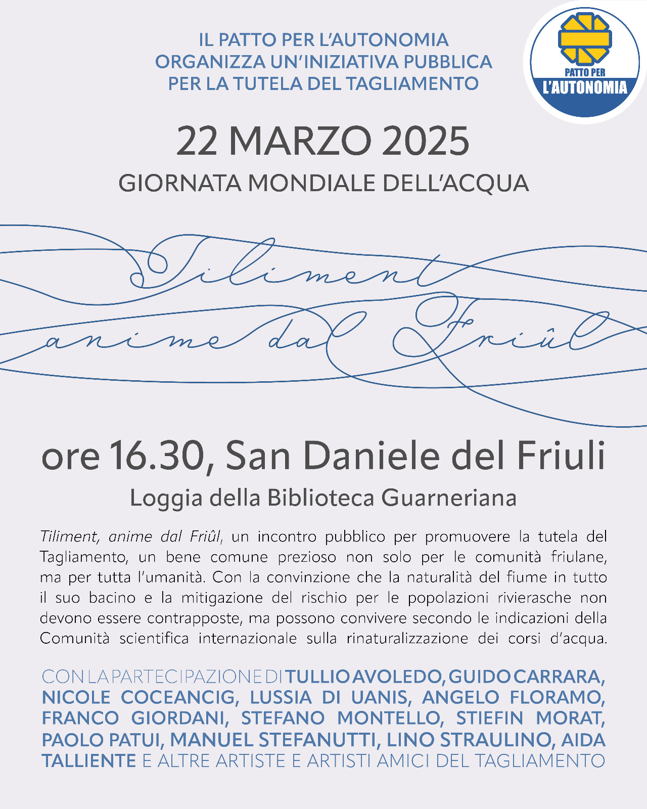 Nella Giornata mondiale dell’acqua, sabato 22 marzo, il Patto per l’Autonomia organizza un incontro pubblico per promuovere la tutela del Tagliamento, un bene comune prezioso non solo per le comunità friulane, ma per tutta l’umanità. All’evento, dal titolo “Tiliment, anime dal Friûl”, che si terrà alle ore 16.30 nella Loggia della Biblioteca Guarneriana a San Daniele del Friuli, hanno aderito esponenti del mondo della musica, della letteratura e del teatro di tutto il Friuli.