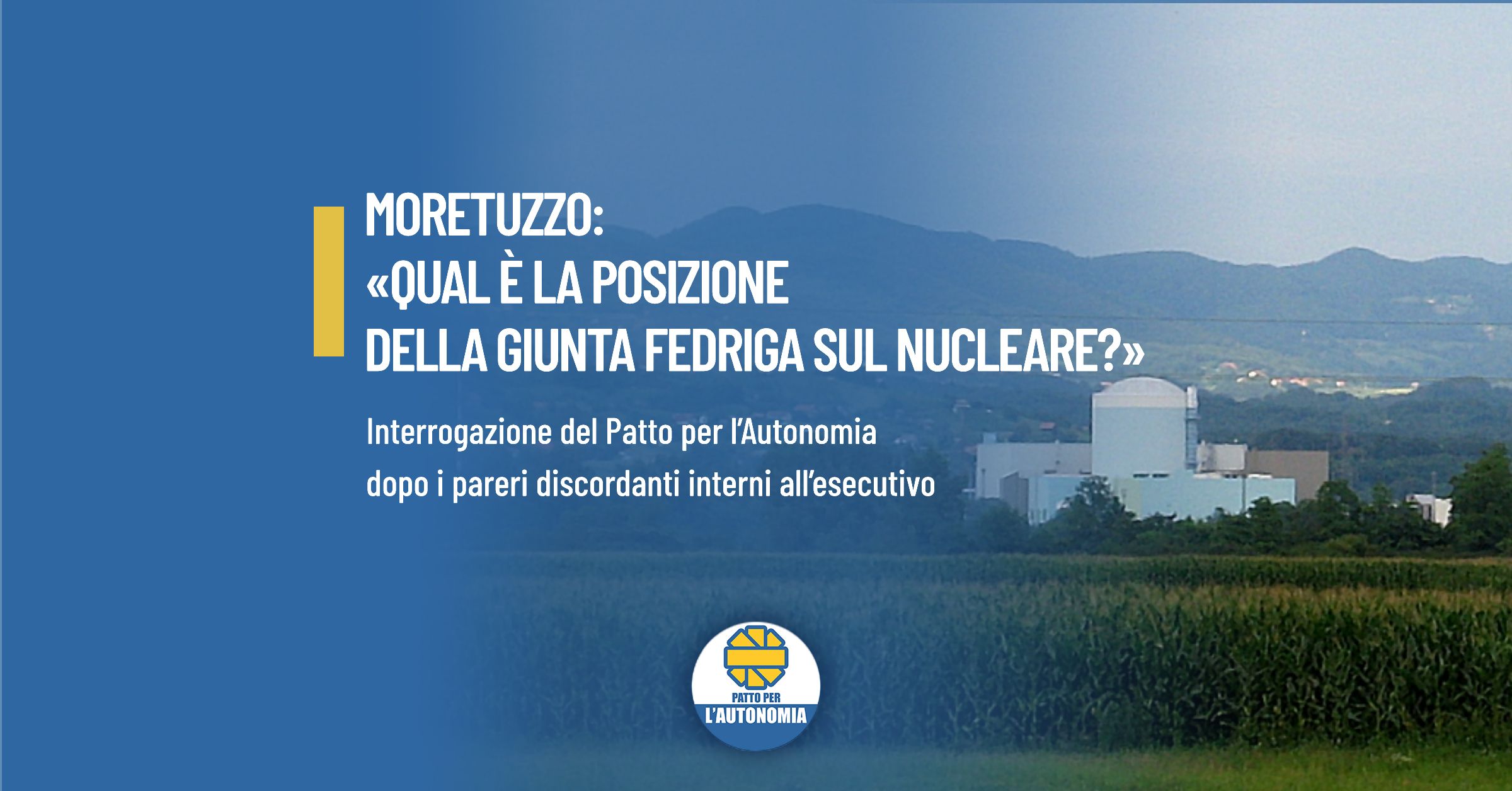 Il Gruppo Consiliare del Patto per l’Autonomia chiede chiarezza al presidente Fedriga sull’orientamento della sua Giunta rispetto all’energia nucleare. Lo fa, alla luce dei pareri discordanti sul tema all’interno dell’esecutivo regionale, con un’interrogazione, depositata oggi (11 gennaio, ndr) e che sarà discussa giovedì 13 gennaio, nel corso della prossima seduta d’Aula.