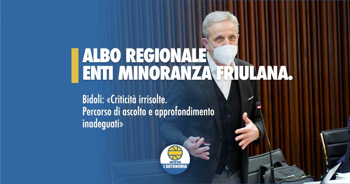 Il consigliere Giampaolo Bidoli – prima della votazione – ha sollevato alcune criticità evidenziate da numerose associazioni intenzionate a iscriversi all’Albo, ma che l’Assessore Roberti, unico interlocutore delle stesse, non ha accolto, se non in minima parte, mantenendo sostanzialmente inalterata la struttura del regolamento. «Sarebbe stato auspicabile un percorso di ascolto e di approfondimento ben diverso da quello intrapreso dall’esecutivo regionale – osserva Bidoli –. Avrebbe consentito di affrontare seriamente alcune questioni importanti per le associazioni interessate all’iscrizione e, dunque, a proseguire la loro attività di promozione della lingua friulana. Perché, per esempio, tra i criteri di valutazione dei programmi finanziabili il numero di associati effettivi ha un peso maggiore, nella decisione finale, sulla capacità di valorizzare la lingua e la cultura friulane? Avremmo voluto saperne di più, ma non sarà possibile per le modalità operative scelte dalla Giunta. Peraltro non ci sarebbe stato neppure il passaggio in Commissione, non fosse stato per un emendamento del Patto per l’Autonomia…».