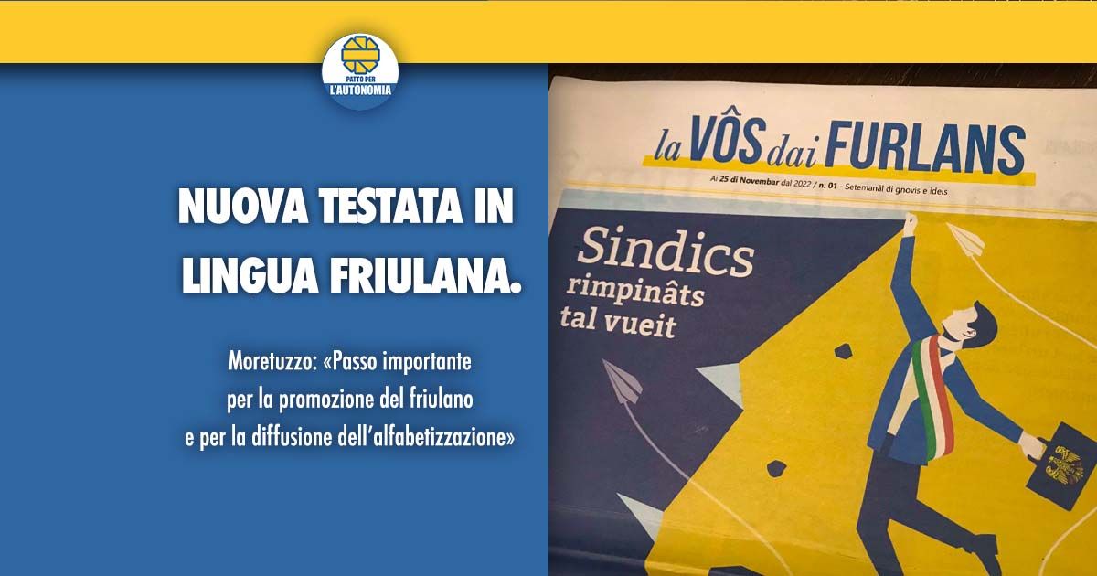 «La nuova testata in lingua friulana è un passo importante per la promozione del friulano, per veicolarne l’uso in tutti i contesti (quindi anche quello informativo), e per lo sviluppo delle competenze nella stessa lingua». Così il capogruppo del Patto per l’Autonomia Massimo Moretuzzo, che oggi a Udine ha partecipato alla presentazione de “La Vôs dai Furlans”, la nuova iniziativa editoriale del gruppo Mediafriuli che comprende un settimanale cartaceo e un sito, entrambi interamente in lingua friulana.