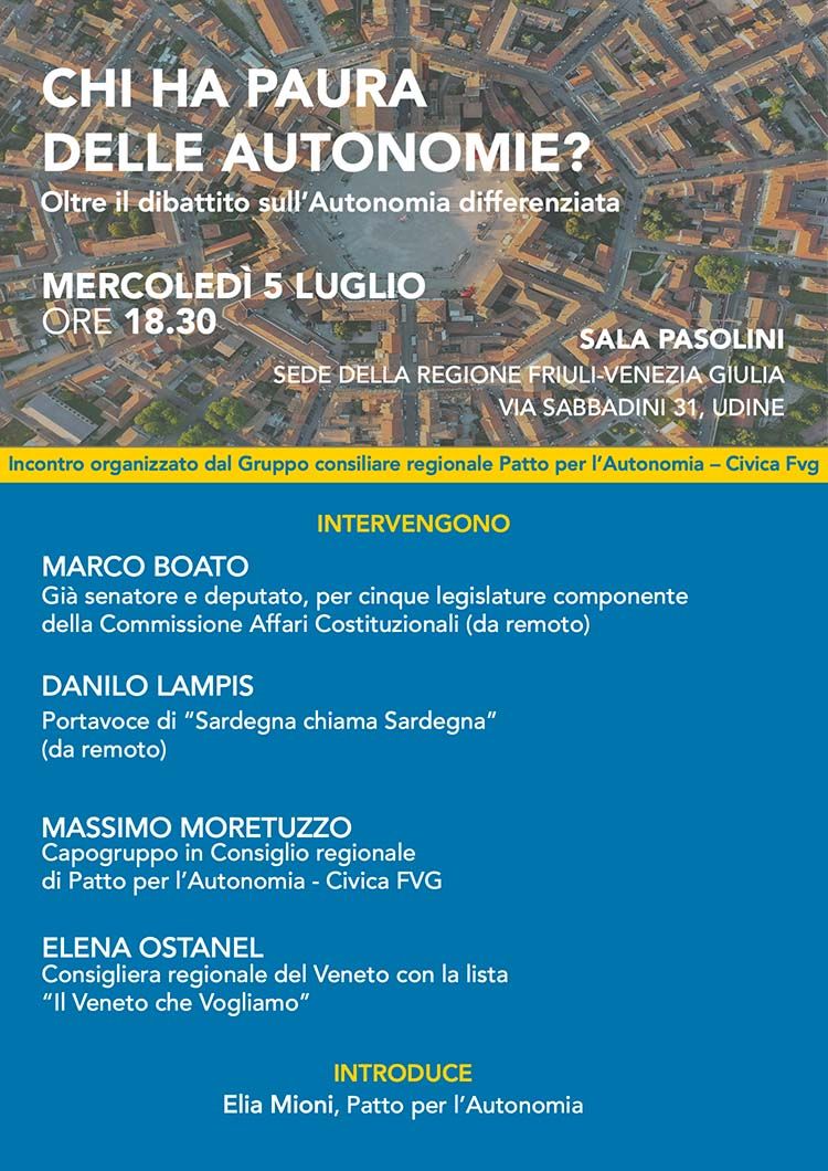 “Chi ha paura delle autonomie? Oltre il dibattito sull’autonomia differenziata” è il titolo dell’incontro promosso dal Gruppo Consiliare del Patto per l’Autonomia-Civica Fvg che si terrà mercoledì 5 luglio, alle ore 18.30, nella Sala Pasolini della sede della Regione Friuli-Venezia Giulia a Udine.