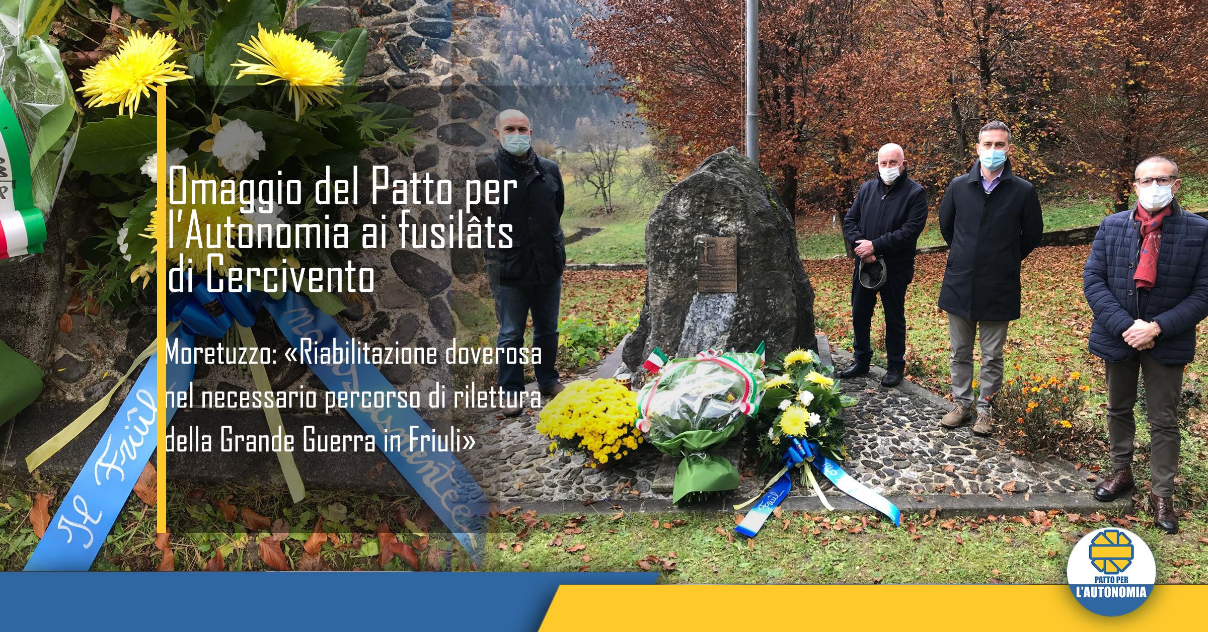 «L’omaggio ai fusilâts di Cercivento è doveroso, e non solo nella giornata odierna. È tempo che anche il Parlamento italiano se ne renda conto». Così il segretario del Patto per l’Autonomia, Massimo Moretuzzo, che oggi, 4 novembre, nella giornata dell’unità nazionale e delle forze armate, si è recato con una delegazione del partito in un luogo simbolico, «lontano dalla retorica nazional-militarista», a depositare un mazzo di fiori al cippo eretto a Cercivento in ricordo degli alpini Giovanni Battista Coradazzi, Angelo Massaro, Basilio Matiz e Silvio Gaetano Ortis, fucilati “per l’esempio” negli anni terribili della Grande Guerra, vittime del militarismo ottuso.