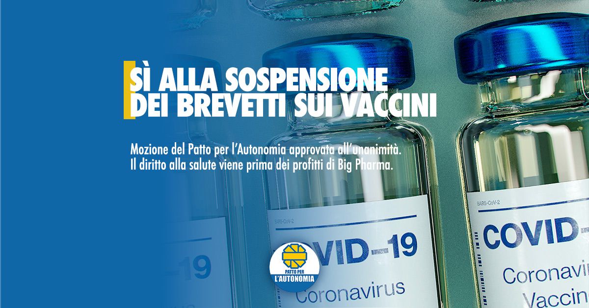 Sì alla sospensione dei brevetti sui vaccini, Mozione del Patto per l’Autonomia approvata all’unanimità
