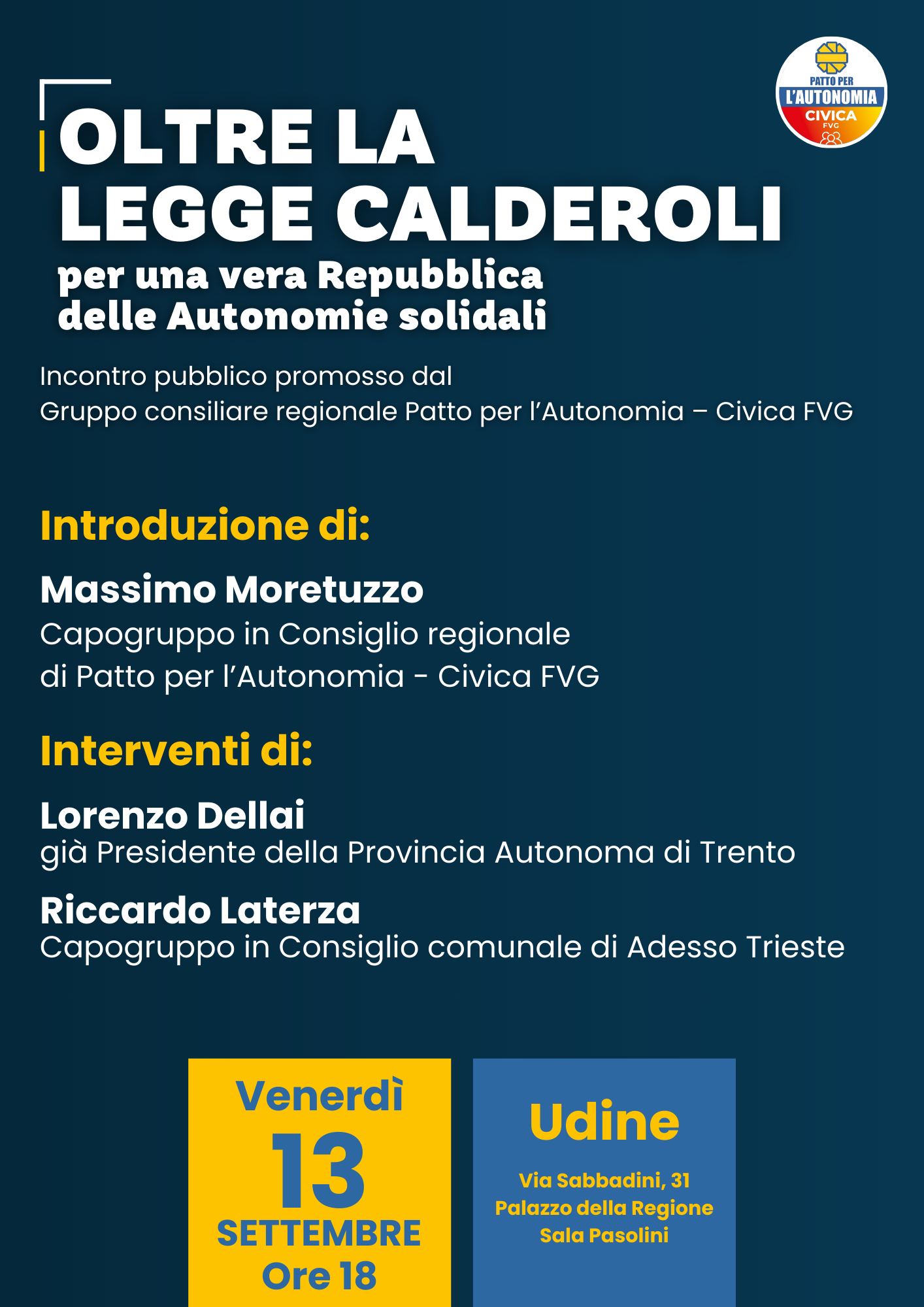 “Oltre la legge Calderoli, per una vera Repubblica delle Autonomie solidali” è il titolo dell’incontro promosso dal Gruppo consiliare regionale del Patto per l’Autonomia – Civica FVG che si terrà venerdì 13 settembre, alle 18, a Udine, nella Sala Pasolini del Palazzo della Regione.