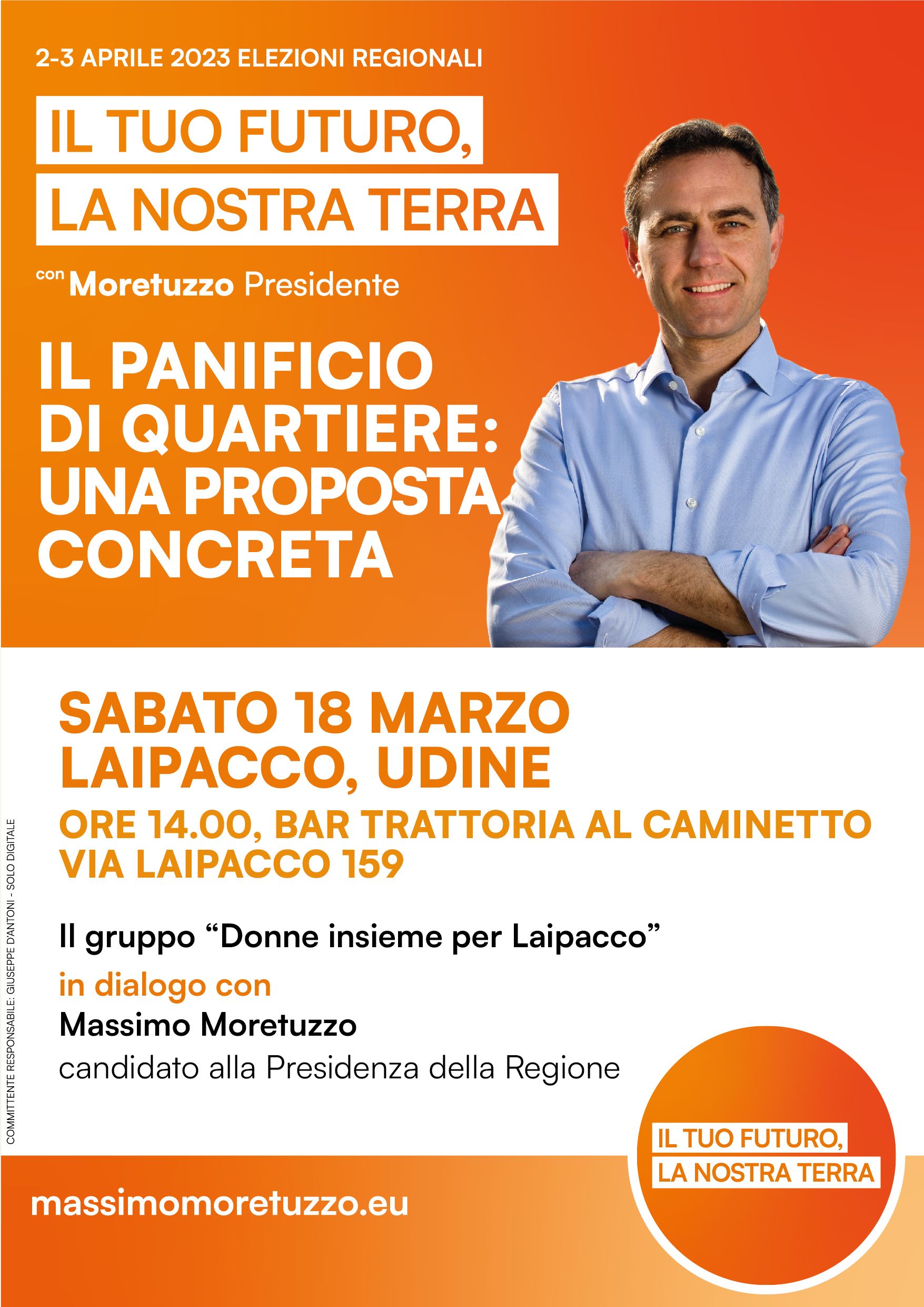 Sabato 18 marzo a Laipacco, alle ore 14.00, al bar trattoria Al Caminetto, in via Laipacco 159, Moretuzzo incontrerà il gruppo “Donne insieme per Laipacco” per un dialogo aperto e per un confronto sul tema del panificio di quartiere che, oltre a rappresentare un servizio per la cittadinanza, diventa anche luogo di socialità.