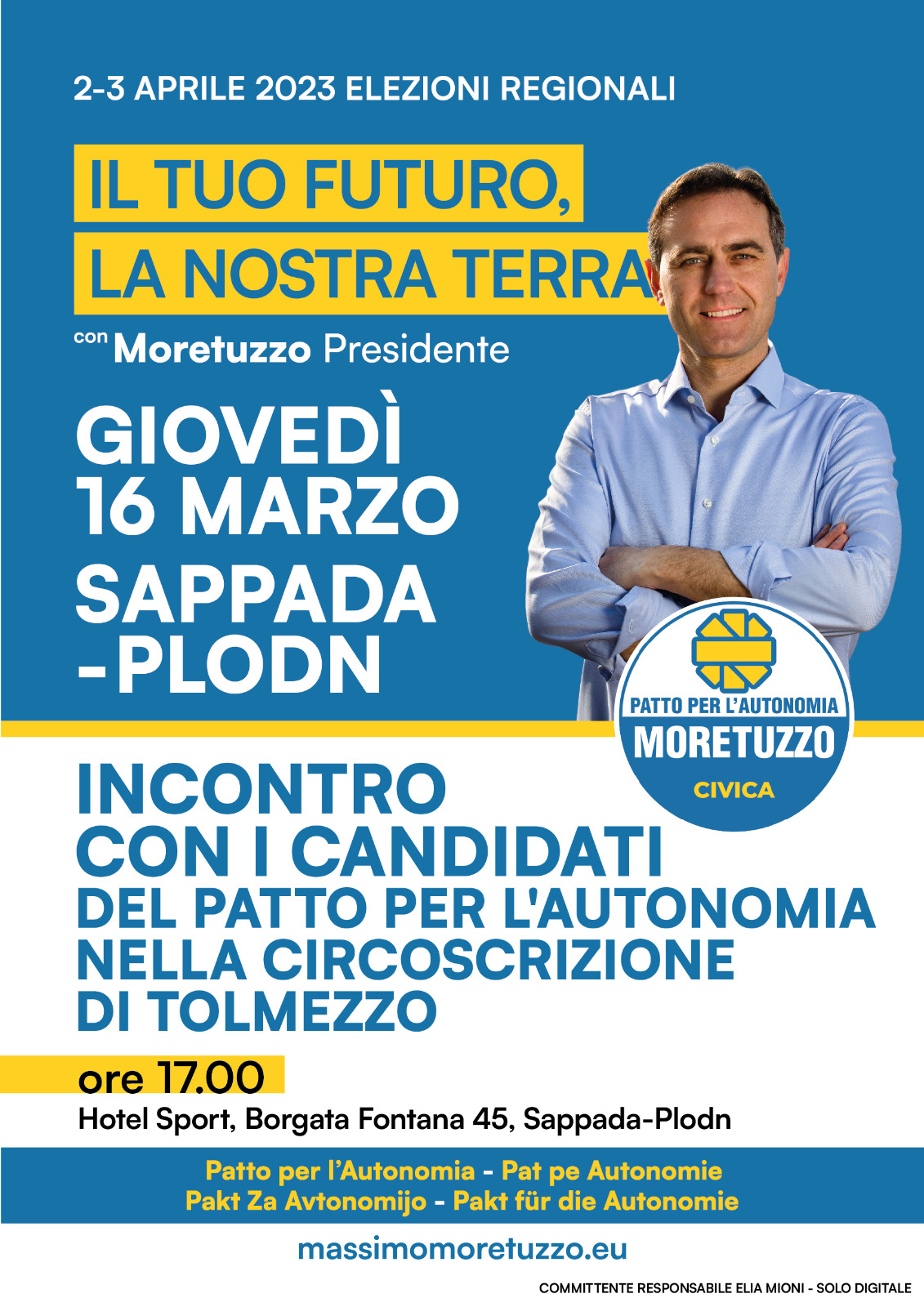 Giovedì 16 marzo a Sappada, alle ore 17.00, all’Hotel Sport, in Borgata Fontana, 45 i candidati nella circoscrizione di Tolmezzo Denis Baron, Stefano Santi e Aura Zanier saranno a disposizione per un confronto con la cittadinanza.