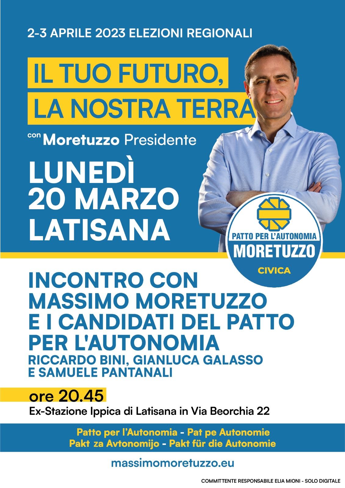 Lunedì 20 marzo Massimo Moretuzzo sarà a Latisana, alle ore 20.45, all’ex Stazione Ippica, in via Beorchia, 22. Assieme a lui, per dialogare con il pubblico, ci saranno i candidati del Patto per l’Autonomia nella circoscrizione di Udine, Riccardo Bini, Gianluca Galasso e Samuele Pantanali.