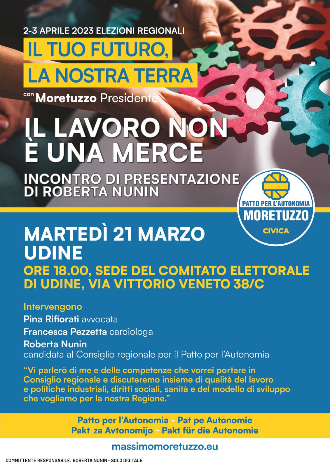 Martedì 21 marzo, alle 18.00, a Udine, presso la Sede del Comitato elettorale in via Vittorio Veneto 38/c si terrà un incontro aperto al pubblico per la presentazione della candidata al Consiglio regionale per il Patto per l’Autonomia nella circoscrizione di Udine, Roberta Nunin, che dialogherà di qualità del lavoro, diritti sociali, sanità e di quale modello di sviluppo si vuole per la regione, assieme all’avvocata Pina Rifiorati e alla cardiologa Francesca Pezzetta,