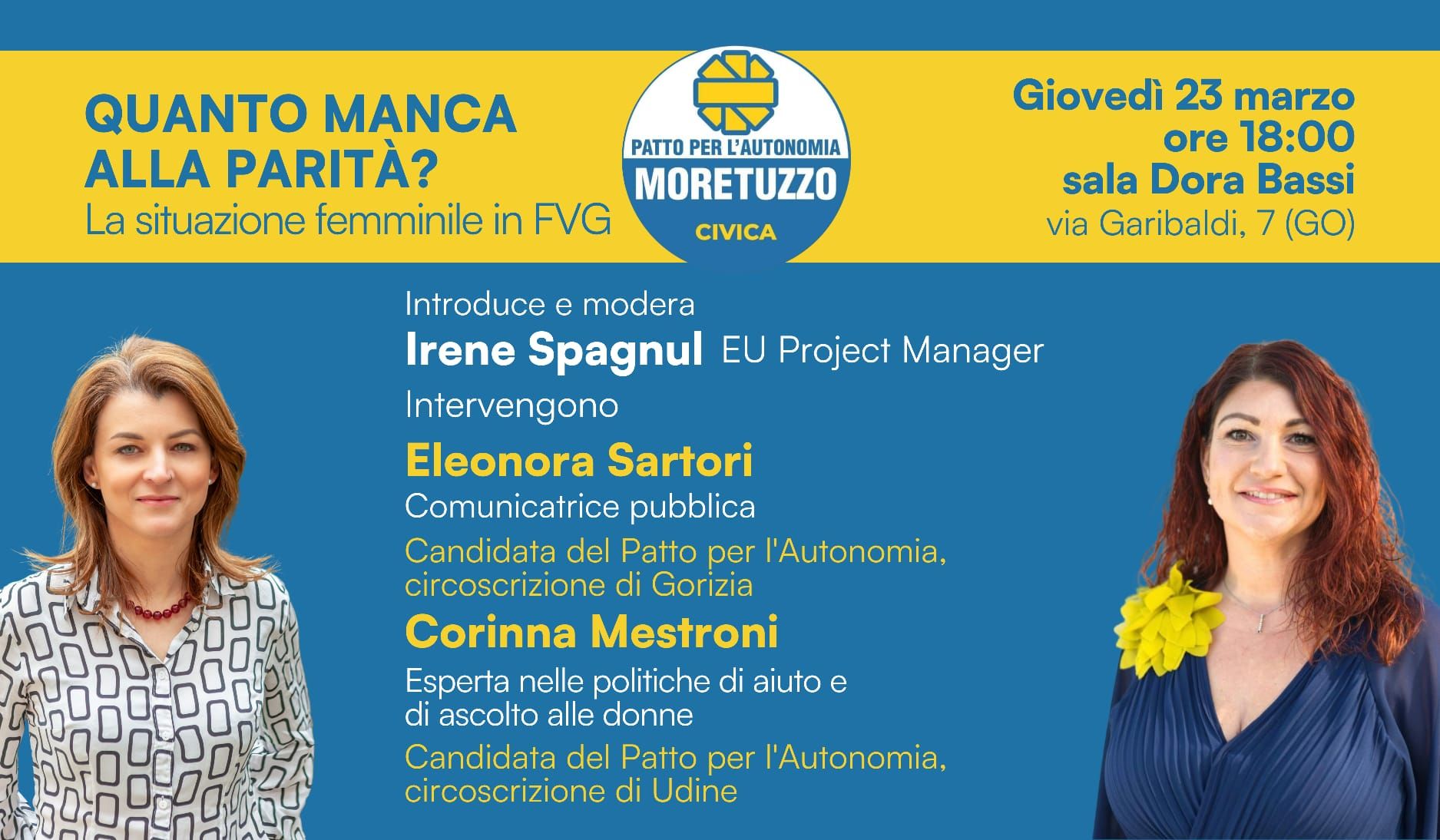 “Quanto manca alla parità?”. E’ questo il titolo dell’incontro in programma giovedì 23 marzo a Gorizia, alle ore 18.00, nella Sala Dora Bassi, in via Garibaldi, con le candidate per il Patto per l’Autonomia, Eleonora Sartori per la circoscrizione di Gorizia e Corinna Mestroni per la circoscrizione di Udine.