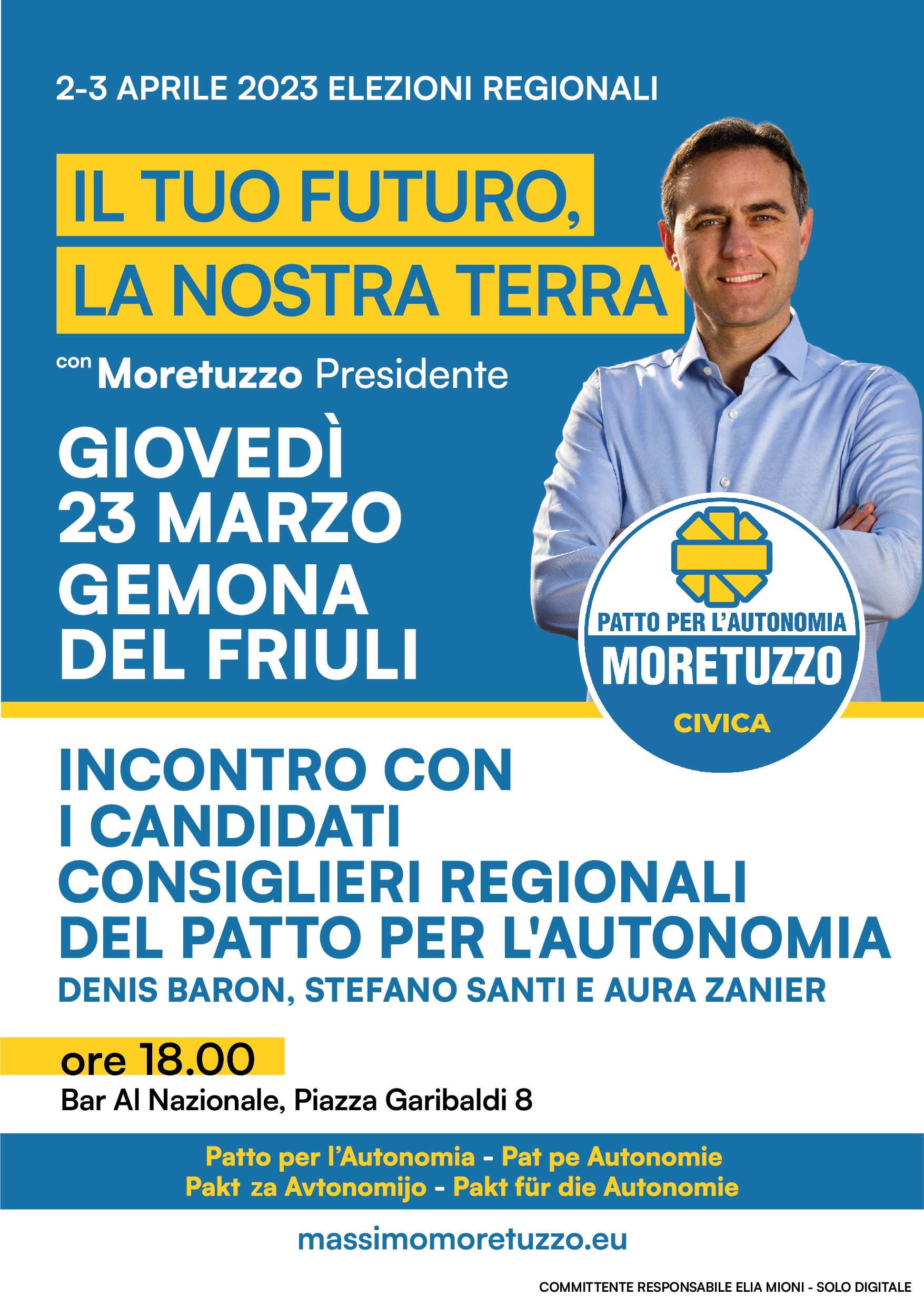 Giovedì 23 marzo a Gemona, alle ore 18.00, al bar Al Nazionale, in Piazza Garibaldi, 8 i candidati nella circoscrizione di Tolmezzo Denis Baron, Stefano Santi e Aura Zanier saranno a disposizione per un confronto con la cittadinanza.