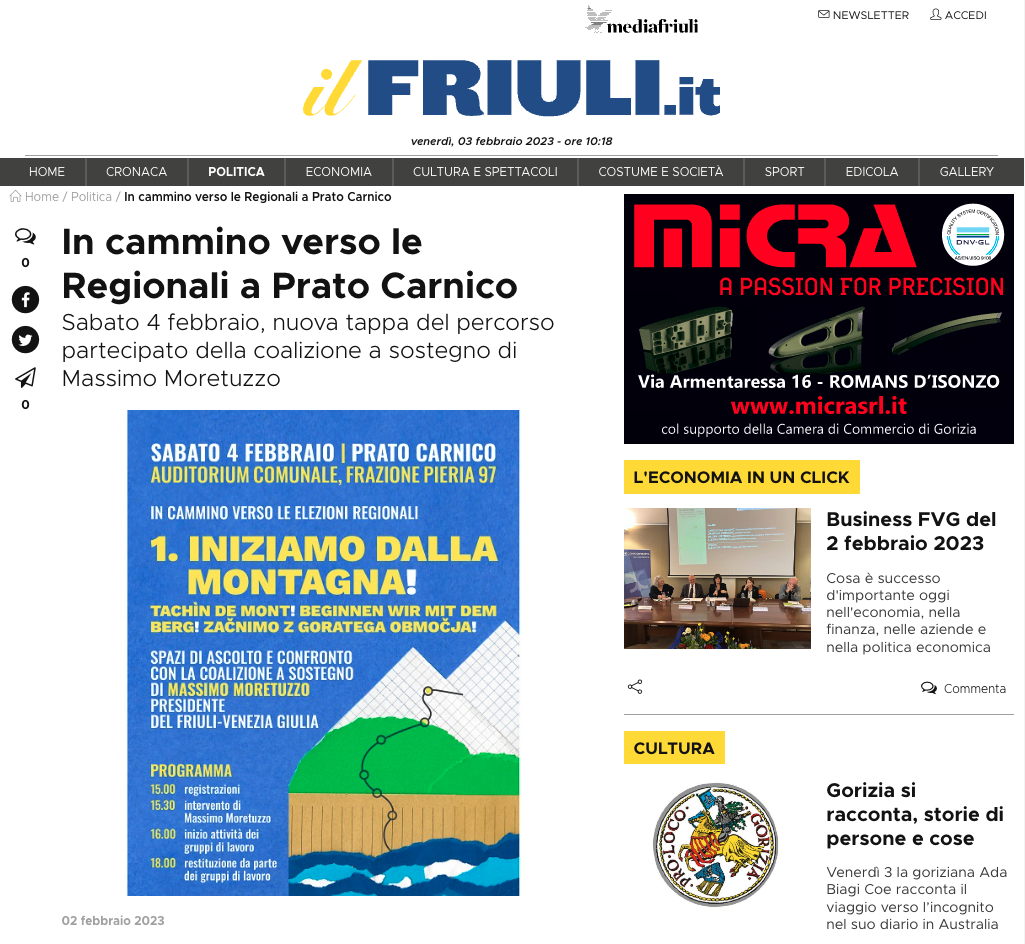 Inizia da Prato Carnico il percorso partecipato della coalizione a sostegno di Massimo Moretuzzo, candidato alla Presidenza del Friuli Venezia Giulia, verso le Regionali del 2 e 3 aprile.
