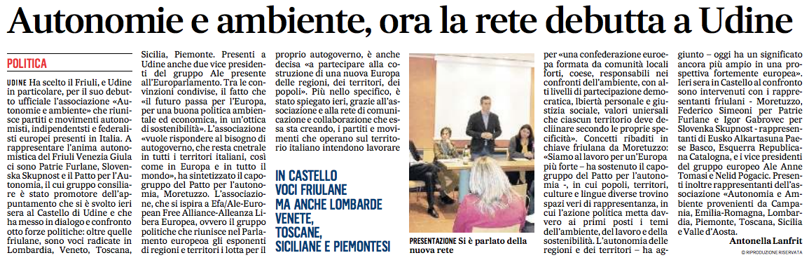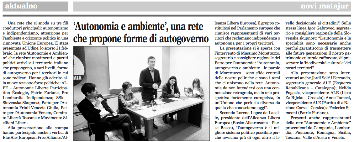 E' la prima esperienza di dialogo e confronto tra partiti e movimenti autonomisti, indipendentisti e federalisti europei presenti sui territori italiani, le cui radici e il cui futuro stanno all’interno di un’Europa rinnovata. L’associazione “Autonomie e Ambiente” è stata presentata ufficialmente per la prima volta oggi, venerdì 21 febbraio, nel corso di una conferenza stampa a Udine alla quale hanno partecipato i rappresentanti della rete italiana e i vertici di EFA/ALE – European Free Alliance/Alleanza Libera Europea, il gruppo politico che riunisce nel Parlamento europeo esponenti di regioni e territori in lotta per il proprio autogoverno, ma decisi comunque a partecipare alla costruzione di una nuova Europa delle regioni, dei territori, dei popoli, al quale si sono ispirati i promotori di AeA, associati all’EFA.“