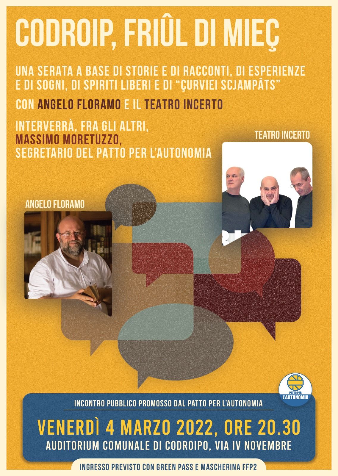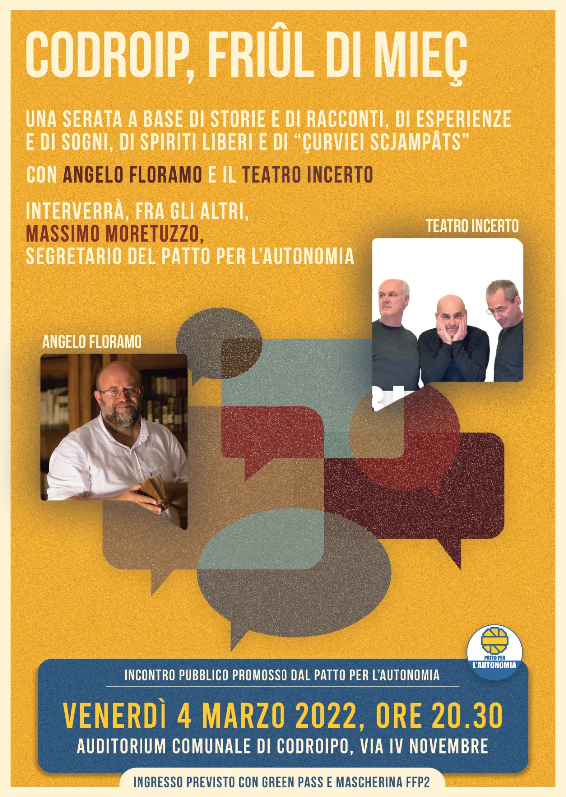 “Codroip, Friûl di mieç” è il titolo dell’incontro pubblico promosso dal Patto per l’Autonomia, in programma venerdì 4 marzo, alle 20.30, all’auditorium comunale di Codroipo. Una serata a base di storie e di racconti, di esperienze e di sogni, di spiriti liberi e di “çurviei scjampâts” con lo scrittore e storico Angelo Floramo e Fabiano Fantini, Claudio Moretti ed Elvio Scruzzi del Teatro Incerto. Dialogheranno con donne e uomini impegnati a diverso titolo sul territorio che porteranno le loro esperienze e proposte sul presente, ma soprattutto sul futuro di Codroipo e del Medio Friuli: «un tempo riferimento a livello regionale per la capacità di fare rete su politiche sociali e culturali di ambito, oggi non più», commenta Massimo Moretuzzo, segretario del Patto per l’Autonomia, che trarrà le conclusioni dell’incontro. «Attraverso voci autorevoli del mondo della cultura e le testimonianze di chi vive questi luoghi, vorremmo aprire un dibattito concreto e cercare di risvegliare la coscienza critica del territorio», spiega Moretuzzo.