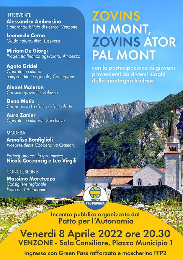 Sono giovani provenienti da diversi luoghi della montagna friulana – che vi risiedono e si impegnano nel loro territorio o che stanno vivendo un’esperienza di studio o di lavoro all’estero, ma vogliono rientrare in Friuli, nella loro comunità – i protagonisti del prossimo incontro promosso dal Patto per l’Autonomia. L’appuntamento, dal titolo “Zovins in mont, zovins ator pal mont”, si terrà venerdì 8 aprile, alle 20.30, nella sala consiliare di Venzone.