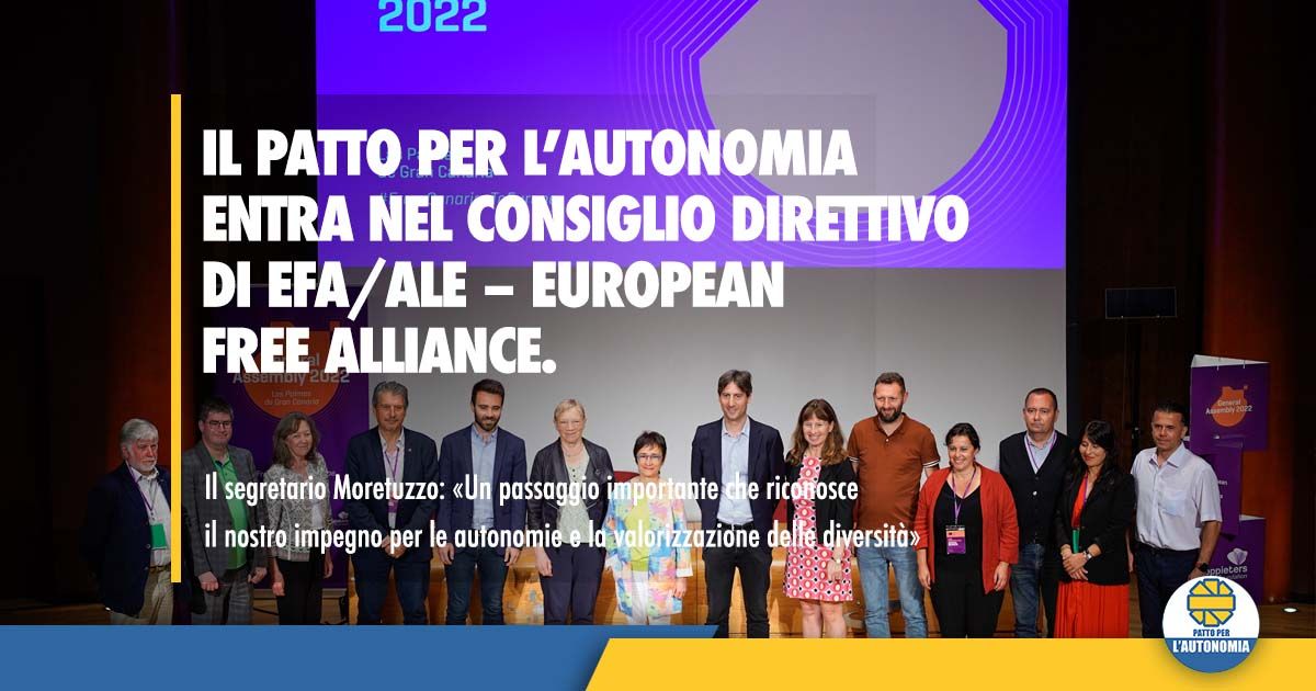 Il Patto per l’Autonomia ha fatto il suo ingresso nel Consiglio direttivo di EFA/ALE – European Free Alliance/Alleanza Libera Europea, di cui fa ufficialmente parte dall’ottobre 2020. EFA è la principale rete europea di raccolta di forze indipendentiste storiche (delle nazioni europee ancora senza stato), autonomiste, federaliste e confederaliste. A Bruxelles rappresenta 49 movimenti e partiti di una ventina di Paesi, e, aderendo al gruppo Verdi europei – Alleanza europea, è la quarta forza politica del Parlamento europeo.