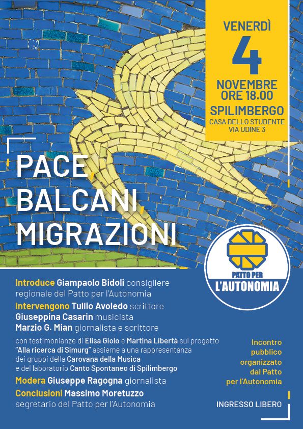 All’iniziativa, introdotta da Giampaolo Bidoli, consigliere regionale del Patto per l’Autonomia, e moderata dal giornalista Giuseppe Ragogna, interverranno lo scrittore Tullio Avoledo, la musicista Giuseppina Casarin e il giornalista e scrittore Marzio Mian, autore con Francesco Battistin del libro “Maledetta Sarajevo. Viaggio nella guerra dei trent’anni. Il Vietnam d’Europa”. Elisa Giolo e Martina Libertà testimonieranno sul progetto a tappe di sensibilizzazione e solidarietà sulla rotta balcanica “Alla ricerca di Simurg” assieme a una rappresentanza dei gruppi della Carovana della Musica e del laboratorio Canto Spontaneo di Spilimbergo. Trarrà le conclusioni Massimo Moretuzzo, segretario e capogruppo in Consiglio regionale del Patto per l’Autonomia. L’ingresso è libero e gratuito.