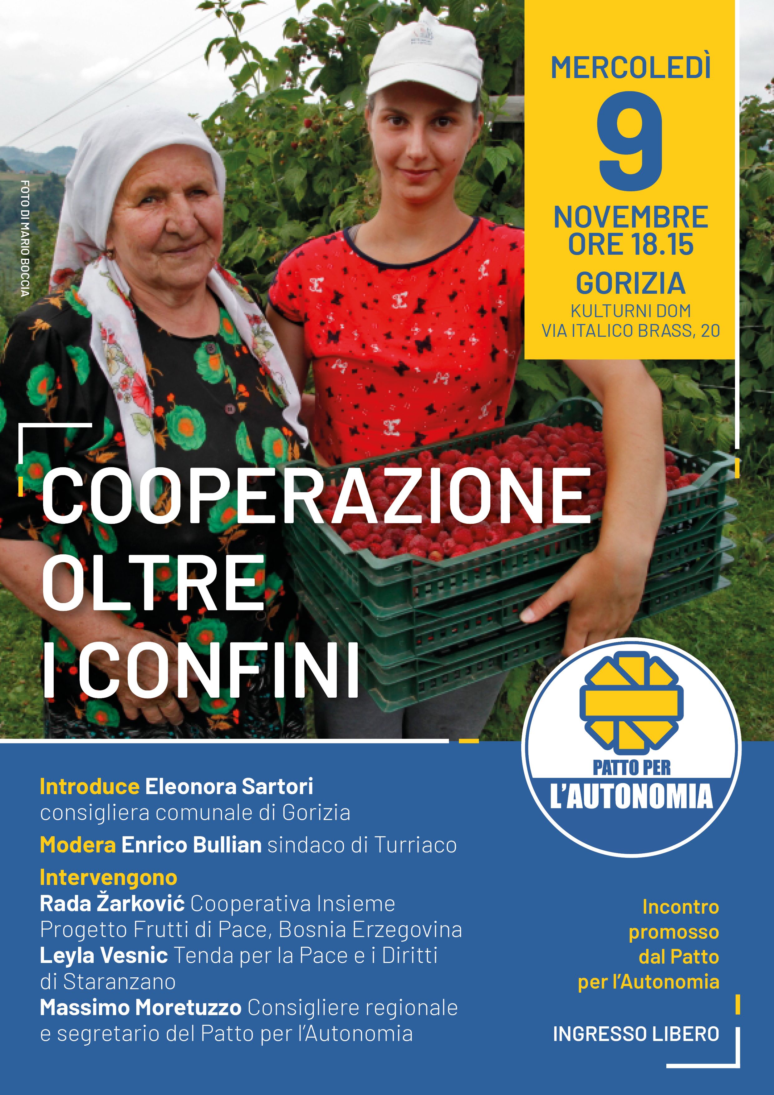 La cooperazione come opportunità per superare frontiere fisiche e barriere socio-culturali, come occasione per generare economie positive, dialogo e confronto, ma anche inclusività. Se ne parlerà – condividendo con il pubblico il racconto di esperienze virtuose – nel corso dell’incontro “Cooperazione oltre i confini” promosso dal Patto per l’Autonomia, che si terrà mercoledì 9 novembre, alle 18.15, al Kulturni Dom di Gorizia.