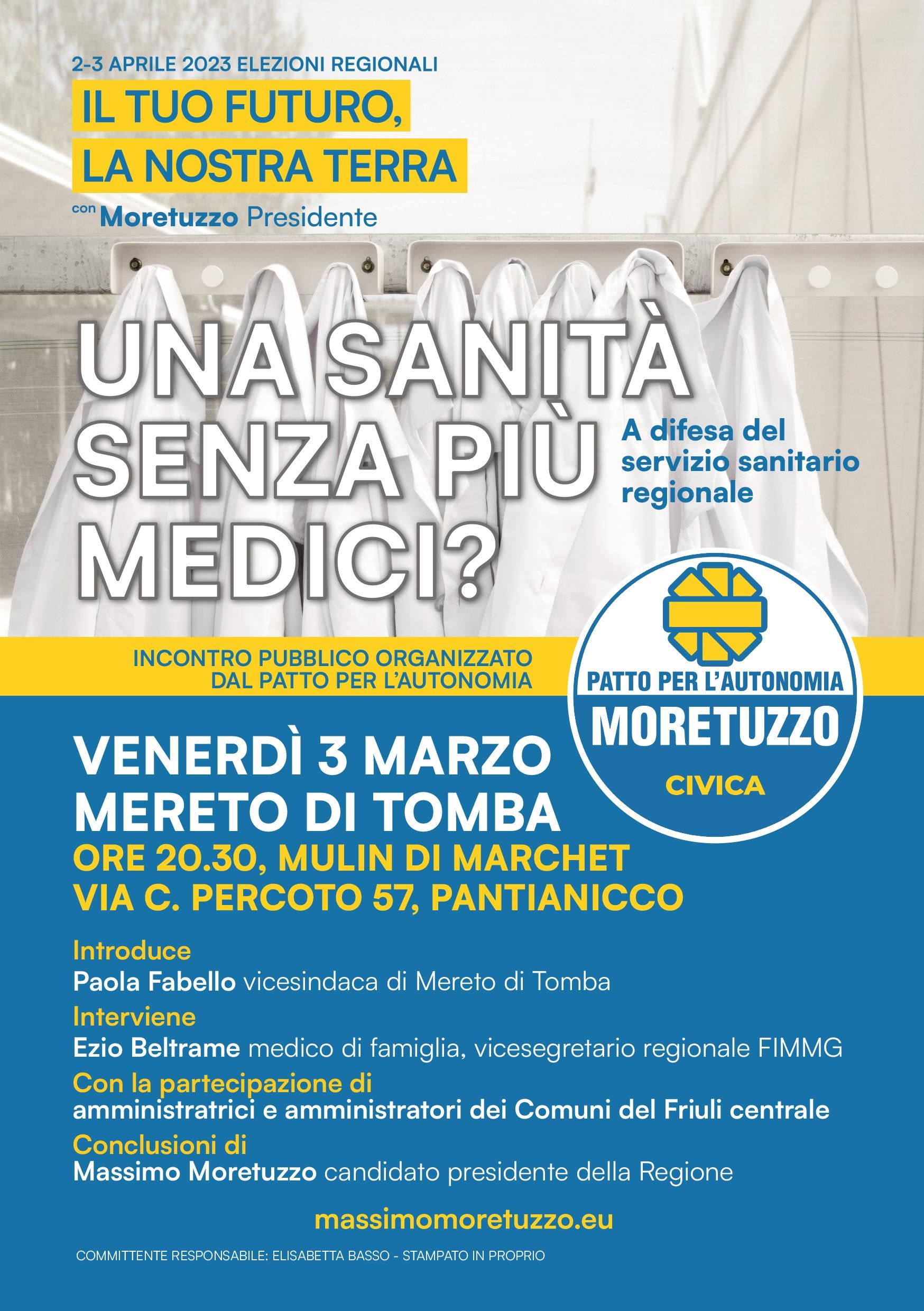 A introdurre la serata sarà Paola Fabello, vicesindaca di Mereto di Tomba. Seguiranno gli interventi di Ezio Beltrame, medico di famiglia e vicesegretario regionale della Fimmg (Federazione italiana medici di medicina generale) e di amministratrici e amministratori dei comuni del Friuli Centrale. Le conclusioni saranno affidate a Massimo Moretuzzo, candidato presidente della Regione. L’incontro sarà dedicato alla grave situazione che stanno vivendo numerosi comuni dell’area del Friuli Centrale a causa della mancanza di medici di famiglia che costringono i cittadini a spostarsi nei comuni limitrofi, con notevole disagio soprattutto per la fascia di popolazione più anziana. Si tratta di una situazione che, attualmente, non trova soluzioni a breve termine, considerando che molti medici di base andranno in pensione nei prossimi anni, rischiando di far crescere le cosiddette zone carenti. Una situazione che porta alcuni cittadini a rimanere senza il riferimento del medico di famiglia, una figura fondamentale per l’assistenza territoriale e un anello di congiunzione importante con le strutture ospedaliere. Nel solo comune di Mereto di Tomba sono 1.300 i cittadini rimasti “orfani” del medico di medicina generale e non è semplice trovare un sostituto. Si tratta, in realtà, di un doppio problema: da una parte i pazienti si trovano privati dell’assistenza di base, dall’altra i medici di famiglia si devono fare carico, seppure temporaneamente, di una quota di assistiti che a volte supera il tetto massimo consentito. Sono criticità a cui va data risposta. Quello della sanità è uno dei principali temi al centro dell’impegno del Patto per l’Autonomia che, nel corso della serata, intende raccogliere le istanze degli amministratori locali e della popolazione.