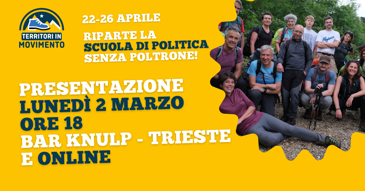 Dal 22 al 26 aprile ci rimettiamo in cammino con la scuola di politica senza poltrone: da Aurisina al confine con la Slovenia, attraversando il Carso, Trieste e Muggia. Non un’aula, ma sentieri e piazze; non lezioni frontali, ma confronto vivo sui temi decisivi del nostro tempo: turismo, ambiente, migrazioni, partecipazione pubblica. Cammineremo insieme a ospiti e testimoni che ci aiuteranno a farci domande scomode e a costruire pensieri nuovi.
