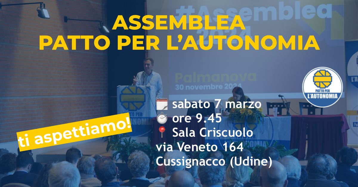Si terrà sabato 7 marzo alle ore 9.45 presso la Sala polifunzionale “Criscuolo”, in via Veneto 164 a Cussignacco (Udine) l'assemblea del Patto per l'Autonomia. Sarà un momento importante di incontro e confronto: discuteremo insieme dei principali temi al centro del dibattito politico di questi mesi – a partire dalla reintroduzione delle aree vaste e dalle prospettive elettorali – e definiremo la programmazione delle prossime attività. Aprirà i lavori con un saluto Maylis Roßberg, candidata alla Presidenza della Commissione europea per conto dell’EFA – European Free Alliance.