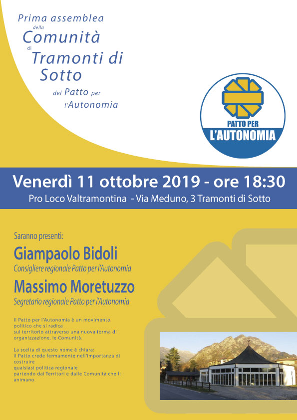 Il Patto per l’Autonomia continua il suo percorso di radicamento sul territorio aprendo nuovi spazi di discussione politica e democratica. Venerdì 11 ottobre sarà costituita la Comunità di Tramonti. Appuntamento alle 18.30 nella sede della Pro Loco Valtramontina in via Meduno 3, a Tramonti di Sotto. Saranno presenti il consigliere regionale del Patto per l’Autonomia Giampaolo Bidoli e il segretario regionale Massimo Moretuzzo, che proseguiranno nel percorso di ascolto e condivisione di idee e progetti per il futuro delle comunità e dei territori attraverso il confronto con i cittadini.