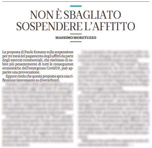 La proposta di Paolo Ermano sulla sospensione per tre mesi del pagamento degli affitti da parte degli esercizi commerciali, che rischiano di subire più pesantemente di tutti le conseguenze economiche dell’emergenza Covid19, può apparire una provocazione.