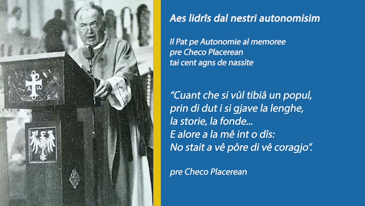 Pre Checo Placerean al jere nassût a Montenârs za fa cent agns, ai 30 di Novembar dal 1920. Al è stât une des figuris plui impuartantis dal autonomisim furlan e tradutôr, adun cun pre Antoni Beline, de Bibie in lenghe furlane, segnant cu la sô olme il Nûfcent furlan. Il Pat pe Autonomie lu memoree cuntun video che al met adun i contribûts di Claudio Violino, Toni Capuozzo, pre Roman Michelot, Laura Nicoloso e Dree Valcic, siei arlêfs e dissepui, cun chê di ricuardâ la sô bataie pe identitât furlane, il so amôr pal Friûl e pal popul furlan. La lezion di pre Checo e torne buine ancje in dì di vuê, mostrant la impuartance di continuâ a cjaminâ sul troi des nestris lidrîs.