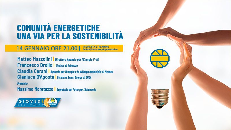 La transizione verso modi di produzione e consumo più sostenibili è diventata una delle grandi sfide della contemporaneità. Sul fronte energetico, anche in Italia è stato dato il via libera alla formazione delle cosiddette comunità energetiche, ovvero una coalizione di utenti che, tramite la volontaria adesione a un contratto, collaborano con l’obiettivo di produrre, consumare e gestire l’energia attraverso uno più impianti energetici locali, condividendo lo sviluppo di un progetto per la produzione di energia rinnovabile e i benefici economici e sociali che ne derivano. Se ne parlerà domani, giovedì 14 gennaio, nel corso del prossimo appuntamento dei “Giovedì del Patto”, dal titolo “Comunità energetiche, una via per la sostenibilità”, insieme a Matteo Mazzolini, direttore dell’Agenzia per l’energia del Friuli-Venezia Giulia, il sindaco di Tolmezzo Francesco Brollo, Claudia Carani dell’Agenzia per l’energia e lo sviluppo sostenibile di Modena e Gianluca D’Agosta della Divisione Smart Energy di Enea, moderati da Massimo Moretuzzo, segretario del Patto per l’Autonomia.