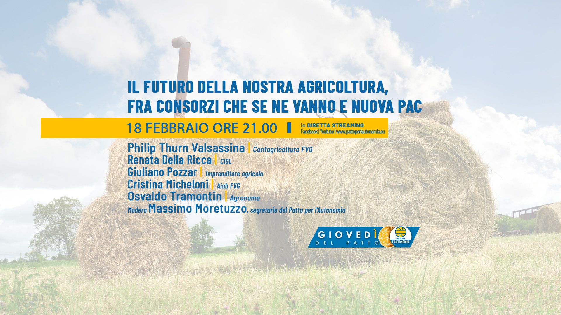 Diretta online giovedì 18 febbraio, alle 21, sulla pagina Facebook, sul sito e sul canale YouTube del Patto per l’Autonomia