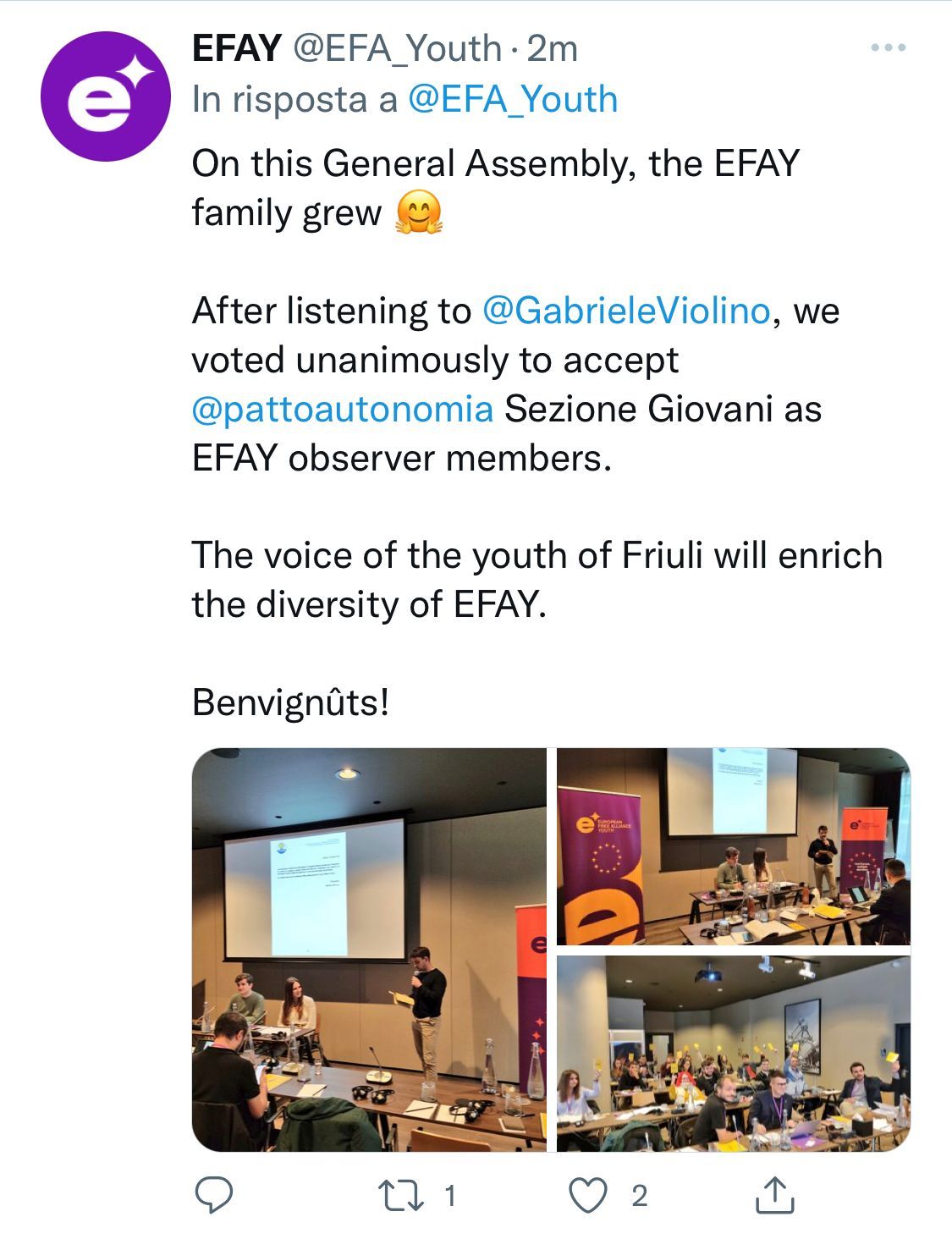 «A Bruxelles ho potuto toccare con mano il cuore politico dell’Europa che sceglie di stare dalla parte delle autonomie, dell’autodeterminazione popolare, della democrazia libera e partecipata – commenta Gabriele Violino, referente del Gruppo giovani del Patto per l’Autonomia –. L’adesione all’EFAY sottolinea l’importanza che hanno i giovani all’interno del Patto, che dimostra di dar loro responsabilità e voce. Abbiamo scelto di stare dalla parte di chi vuole fare politica costruendo la democrazia dal basso e dando voce alle minoranze, lontani da sovranismi e populismi, coscienti che autonomia non significa solo poter decidere da soli, ma presupponga il saper cooperare. Sottoscriviamo la visione di un’Europa dei popoli, e non degli Stati, dove ogni nazione-regione-paese ha uguali diritti. A ciascuna entità territoriale deve essere consentito di sviluppare le proprie potenzialità e di risolvere le proprie problematiche nel segno dell’autonomia, la risposta più adeguata alle necessità delle comunità. Ce lo dicono anche i recenti risultati elettorali che parlano di una disaffezione al voto da parte dei giovani che sentono le istituzioni troppo lontane – continua Violino –. Non vediamo l’ora di poter lavorare con i giovani dell’EFAY nella prospettiva di costruire un Friuli e un’Europa che possa dare voce a tutti ed essere un vero esempio di democrazia».