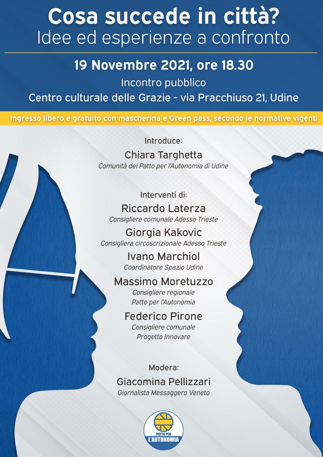 Il presente e il futuro di Udine, autogoverno e partecipazione. Se ne parlerà venerdì 19 novembre, alle 18.30, nel Centro culturale delle Grazie, in via Pracchiuso 21, a Udine, nel corso dell’incontro “Cosa succede in città?” organizzato dal Patto per l’Autonomia.